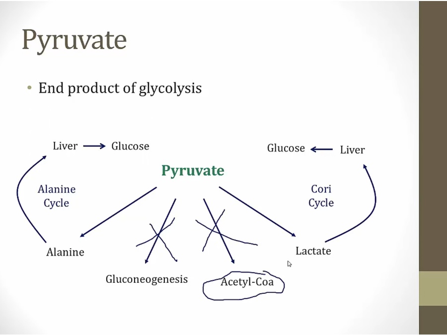 high ATP, slow TCA, high Acetyl- coa and activates pyruvate carboxylase, preferential shunt towards gluconeogenesis