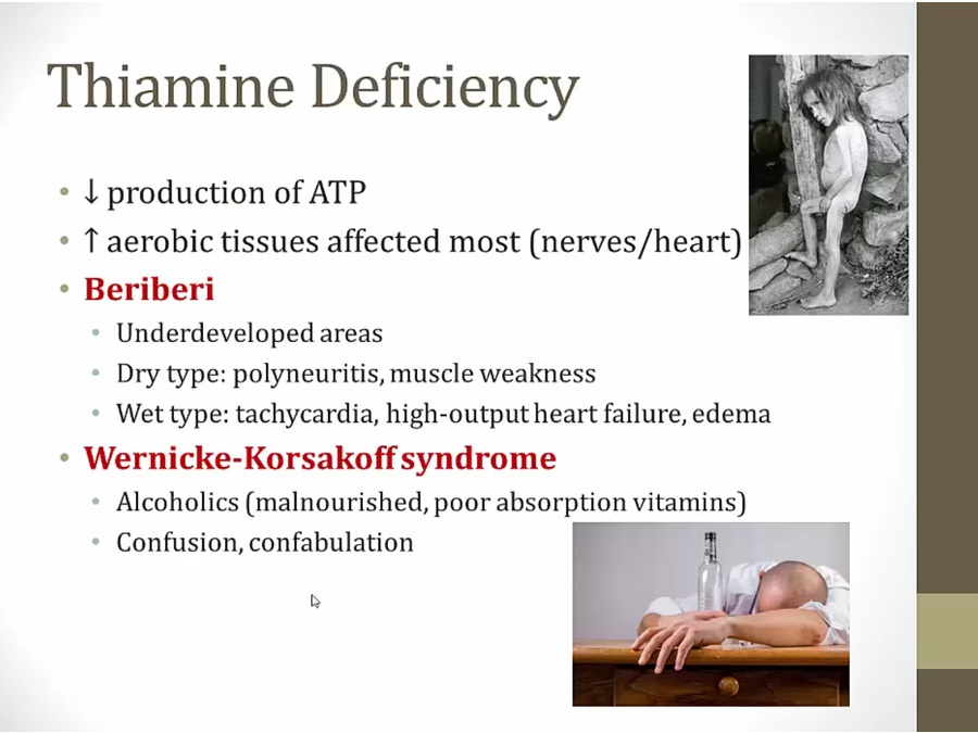 thiamine deficient, cannot convert pyruvate to acetyl-coa, no ATP
