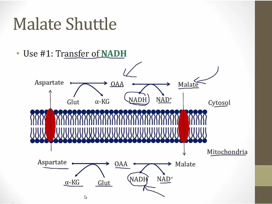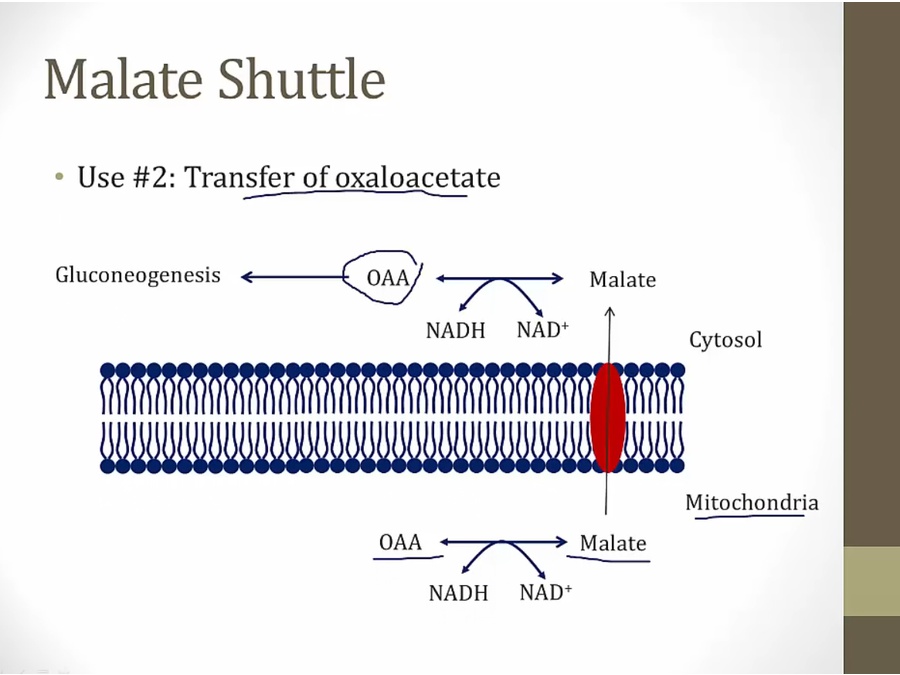transport NADH in for ETC and oxaloacetate out for gluconeogenesis