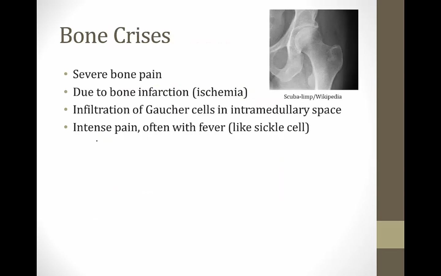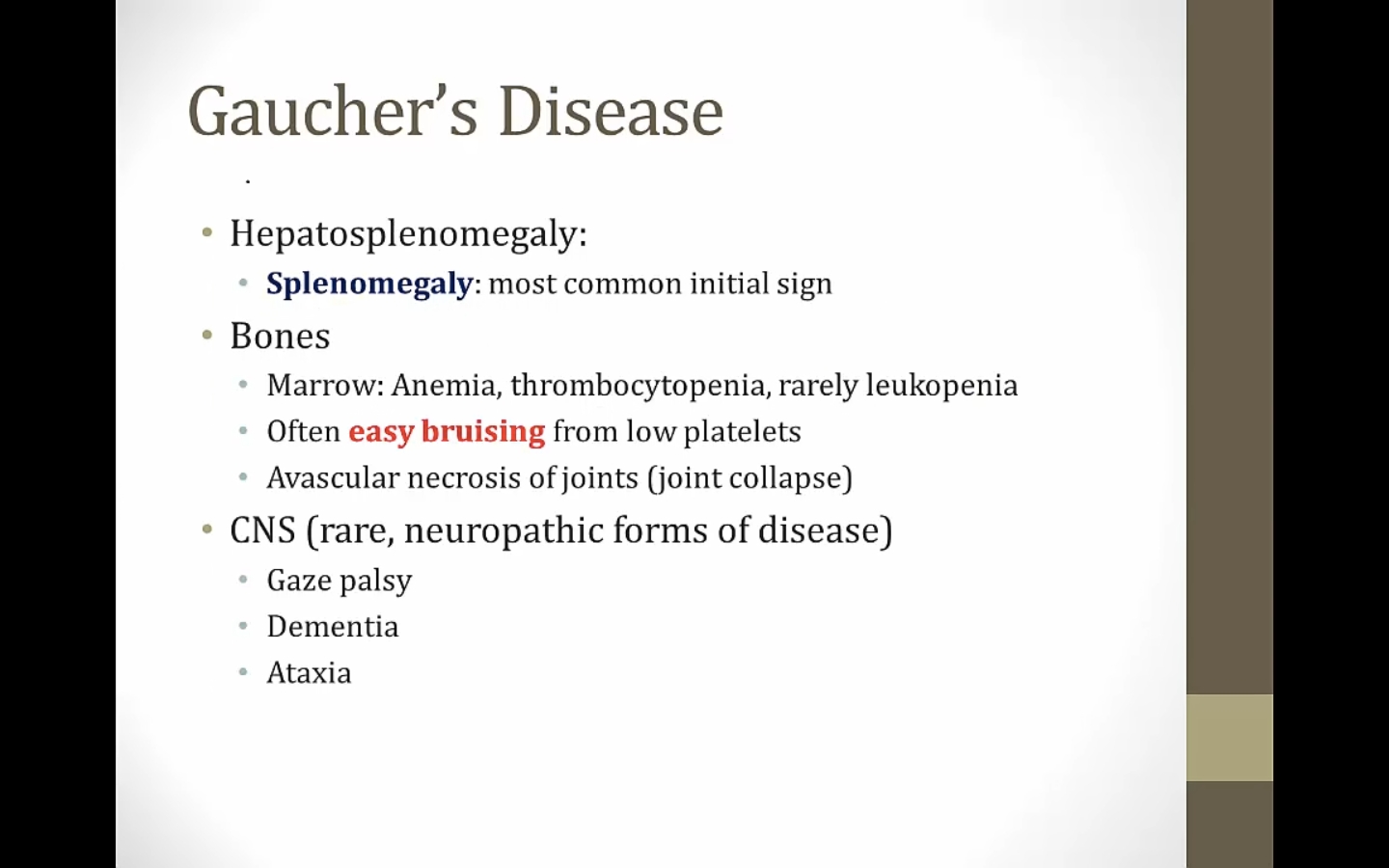 avascular necrosis: ischemia of joints (large macrophages filled with sphingolipids obstruct vessels supplying joints)