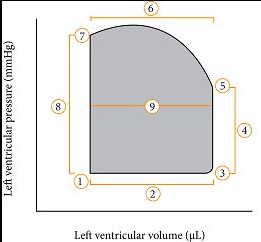 .,At point 5, pressure in ventricle rises high enough to push open aortic valve and the total stroke volume is ejected into the aorta. The ventricle volume decreases, but the ventricular pressure continues to increase until near the very end of this phase. At point 7 , the pressure drop causes the aortic valve to close. The width of the pressure-volume loop is measured graphically to represent the stroke volume. The volume remaining in the LV at point 7 is end systolic volume.