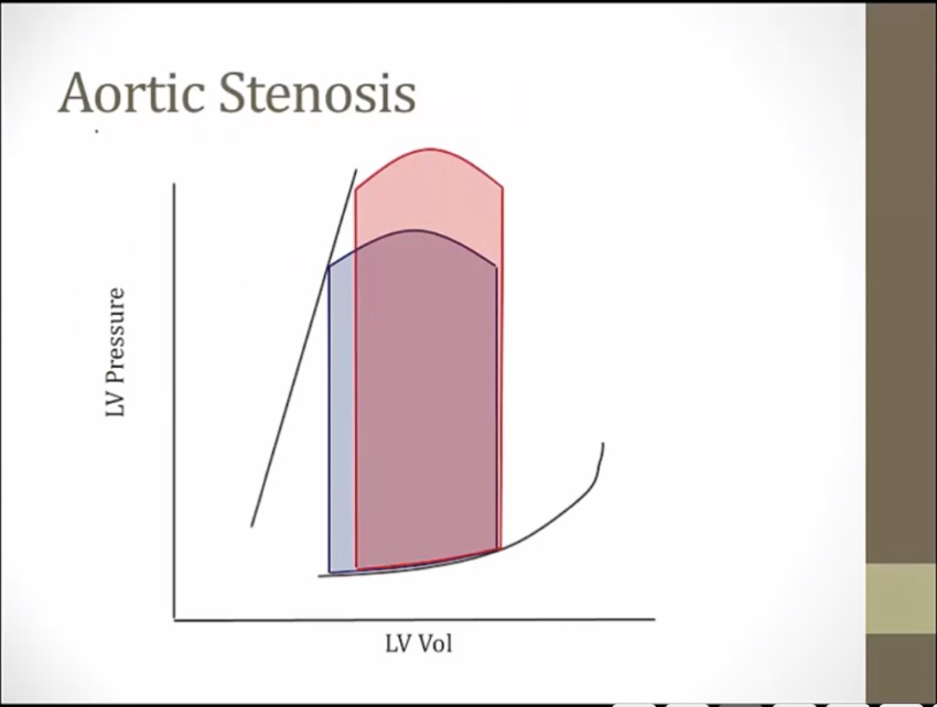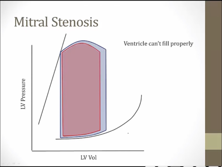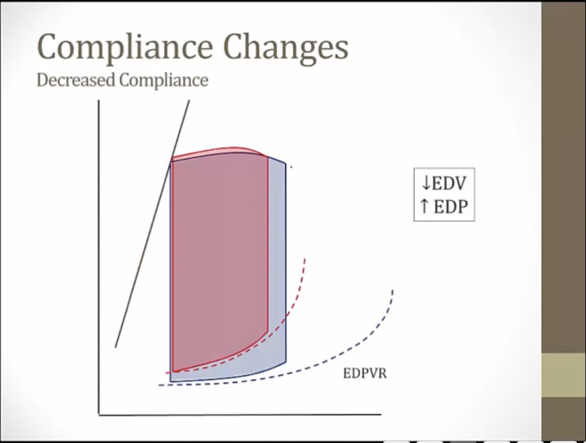 ventricle cannot fill and stiffer, higher pressure, lower volume