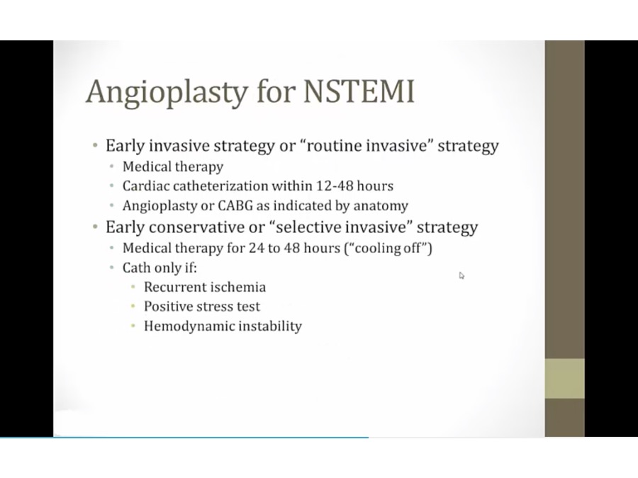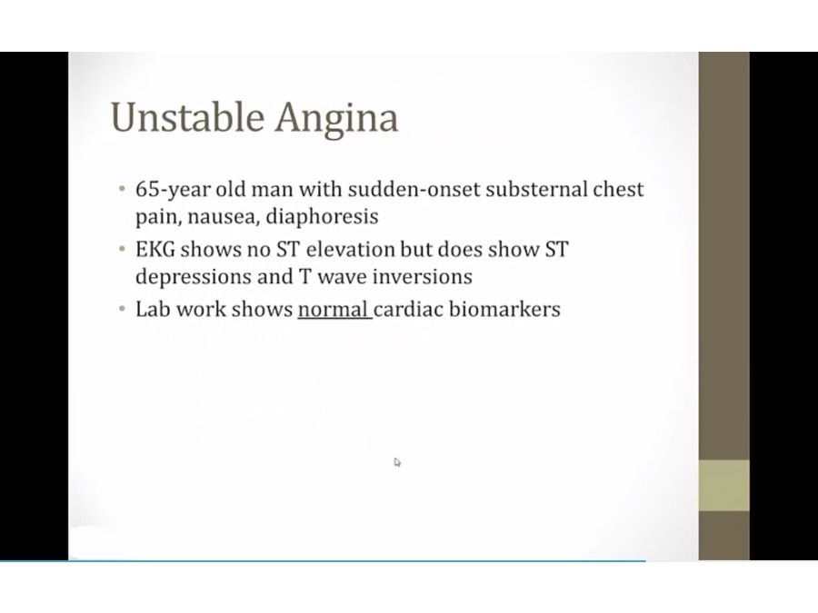 unstable angina: ruptured plaque, clot, subendothelial (ST depression) ischemia (no markers)