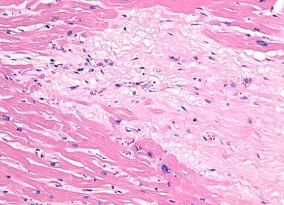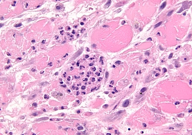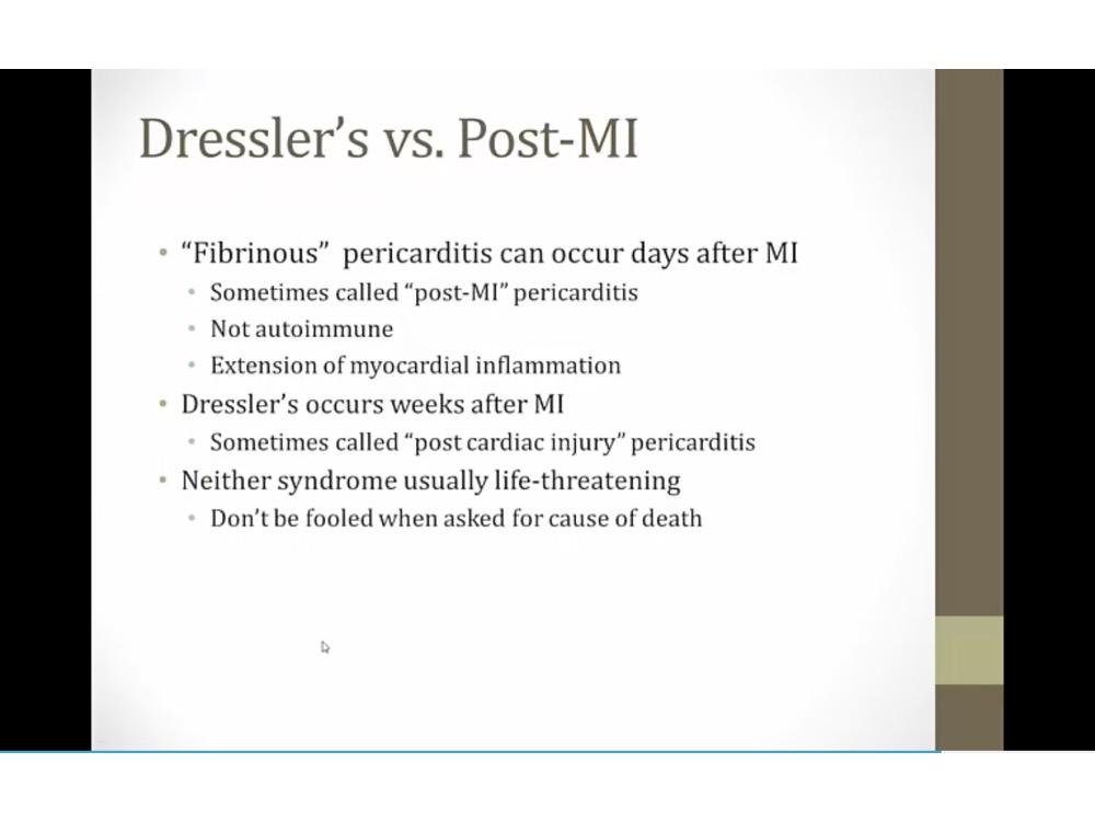 neutrophil: transmural inflammation, exudate leak to pericardium, pericarditis. Only with transmural inflammation