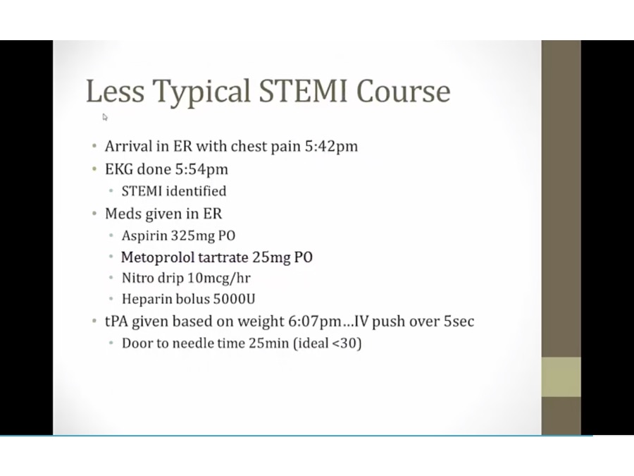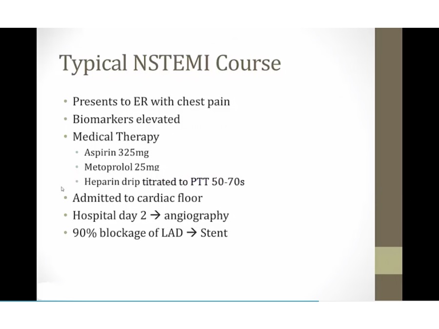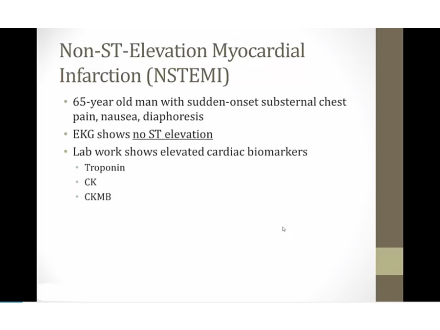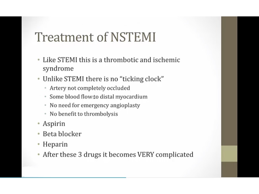 NSTEMI: subendothelial necrosis, clot not completely obstruct artery (not transmural yet)