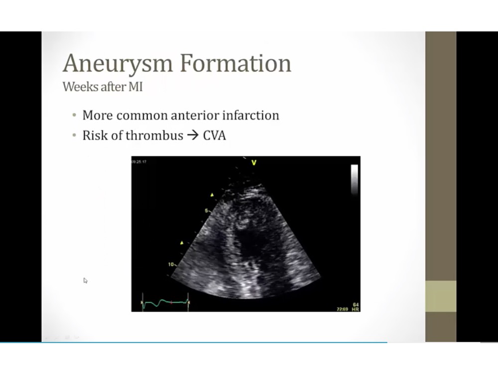 scar: not as strong as myocardium, not good movement, stasis, aneurysm/thrombus