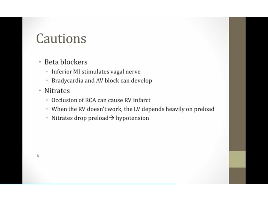inferior MI: bradycardia and AV block already from parasympathetic stimulation. Adding beta blocker make it worse