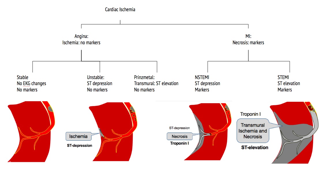 prinzmetal: transmural (ST elevation) ischemia (no markers)