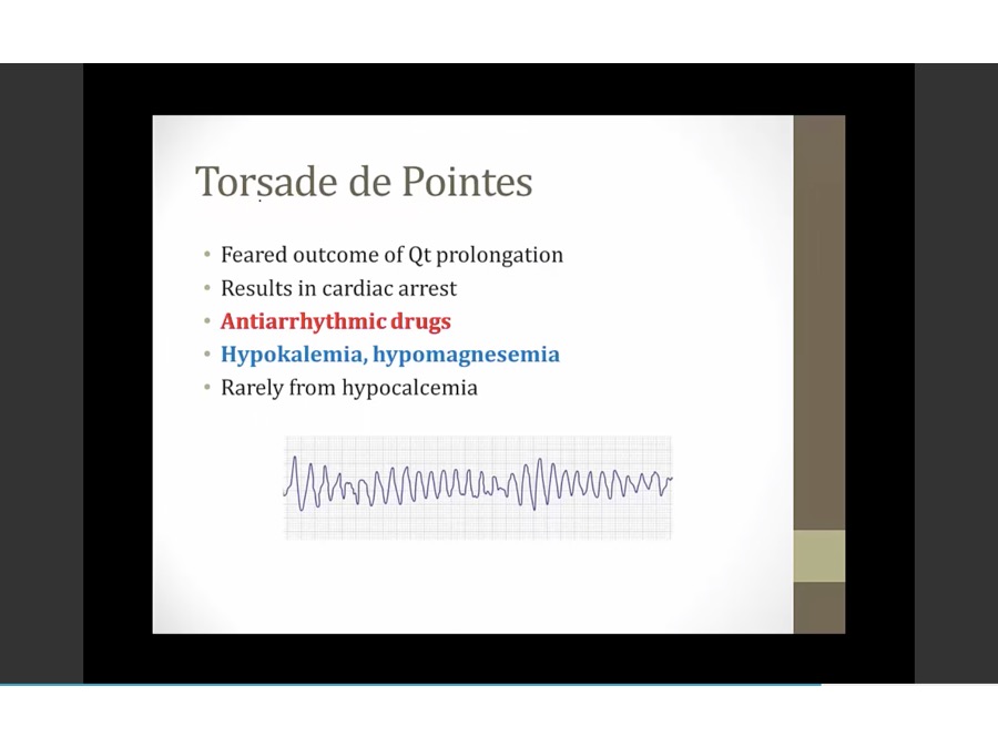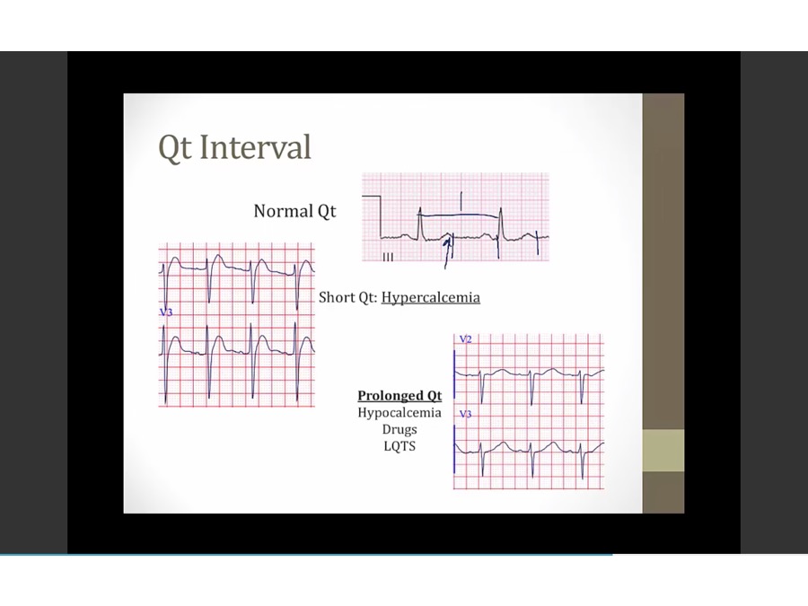 hypocalcemia: less driving force to move Ca in, longer for Ca to go in, longer for QT interval to occur (myocyte in ventricles to depolarize, repolarize )