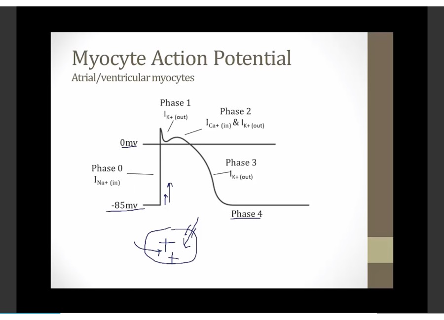 phase 0: voltage begins to rise from positive ions entering via gap junction, Na channels open, further rise positive charges, positive loop
