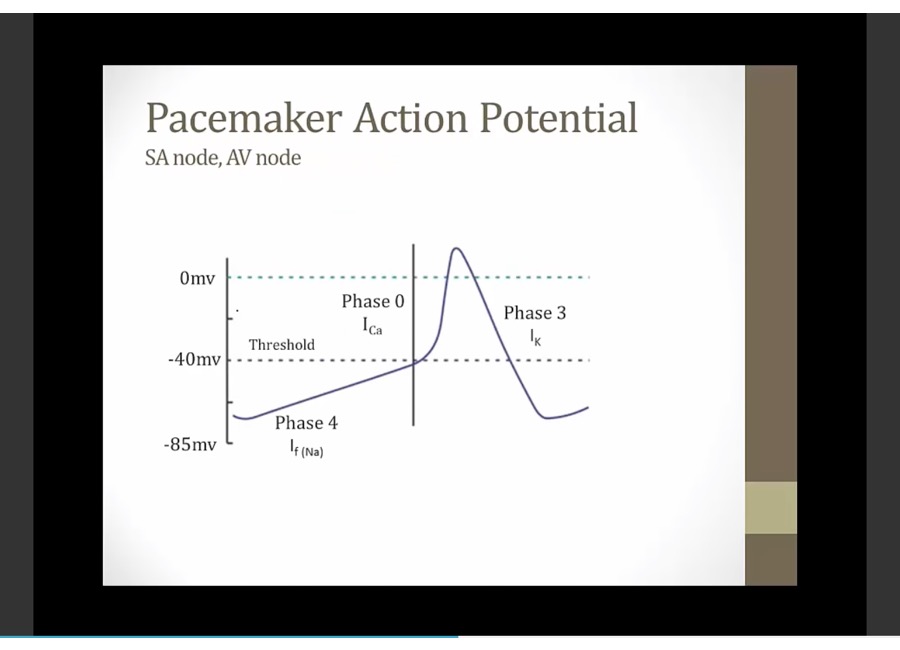 AV node, same shape, phase 4 slower, longer to reach threshold, usually depolarized by SA signal before threshold
