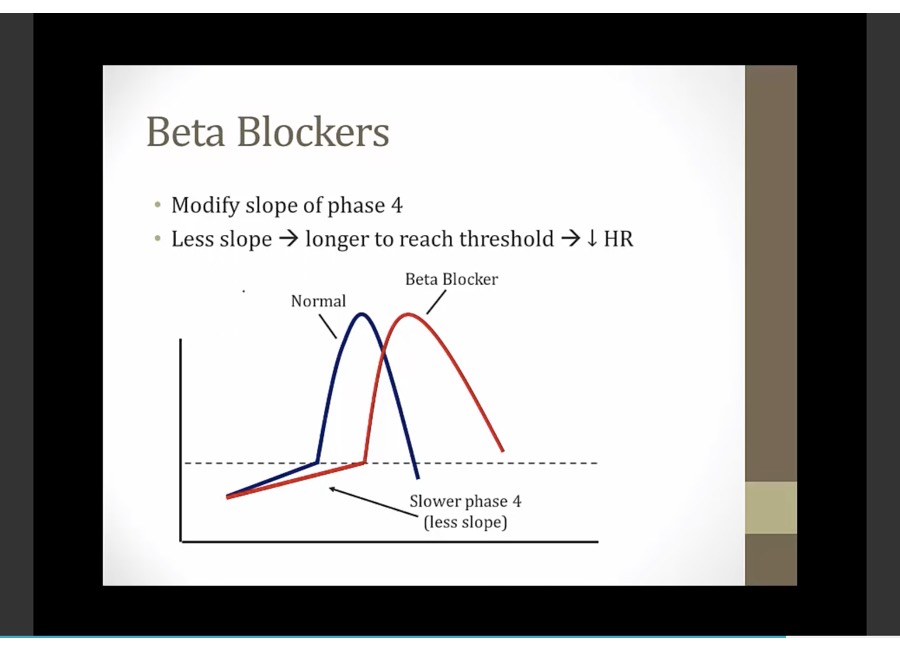 Sliding up the keys: beta blockers prolong phase 4 of the nodal action potential -> decreased pacemaker activity, prolonged conduction time and refractory period.