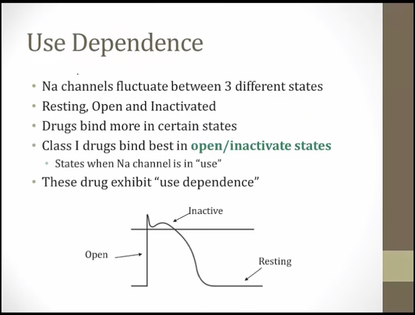 Heart watch tipping mic stand: "use dependance"- class I antiarrhythmics have a greater effect on rapidly depolarizing tissues (increased heart rate causes slower phase 0 upstroke) (great for tachycardias and minimally affect normal cells)