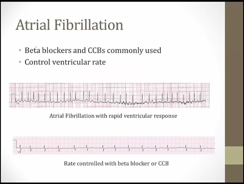 Lit up top: beta blockers treat supraventricular arrhythmias (e.g. atrial fibrillation with RVR)