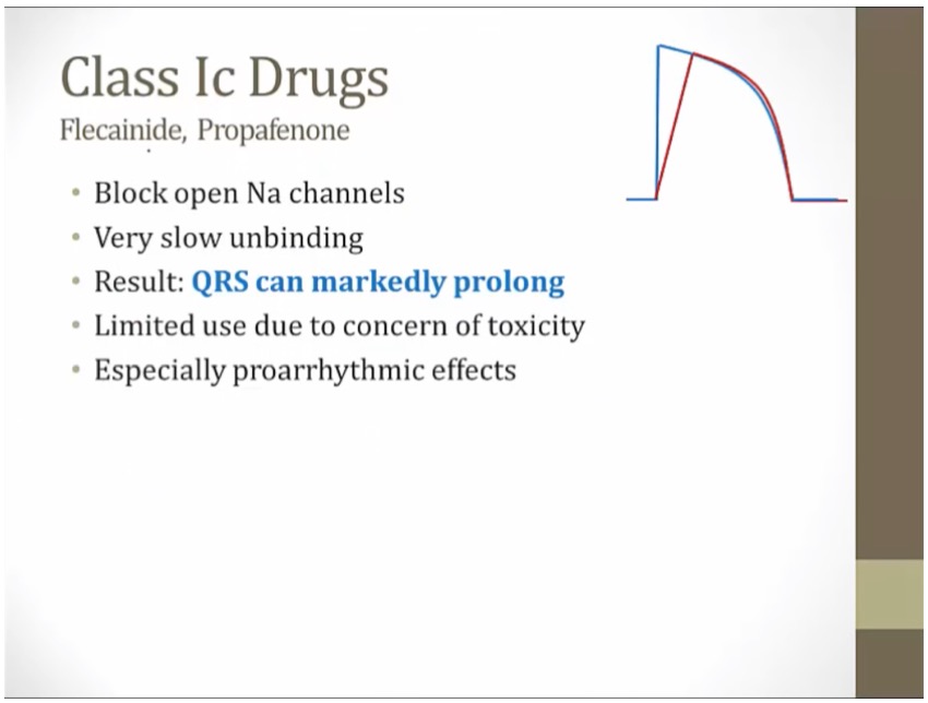 Tightly held peanut butter jar: class IC antiarrhythmics have an strong binding affinity for the Na+ channel (strong use-dependence, drastic slowing of the phase 0 upstroke)
