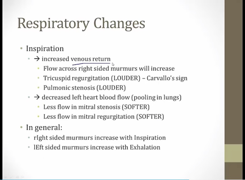 inspiration: dilate veins in lungs, drops venous return to left side of heart, quieter