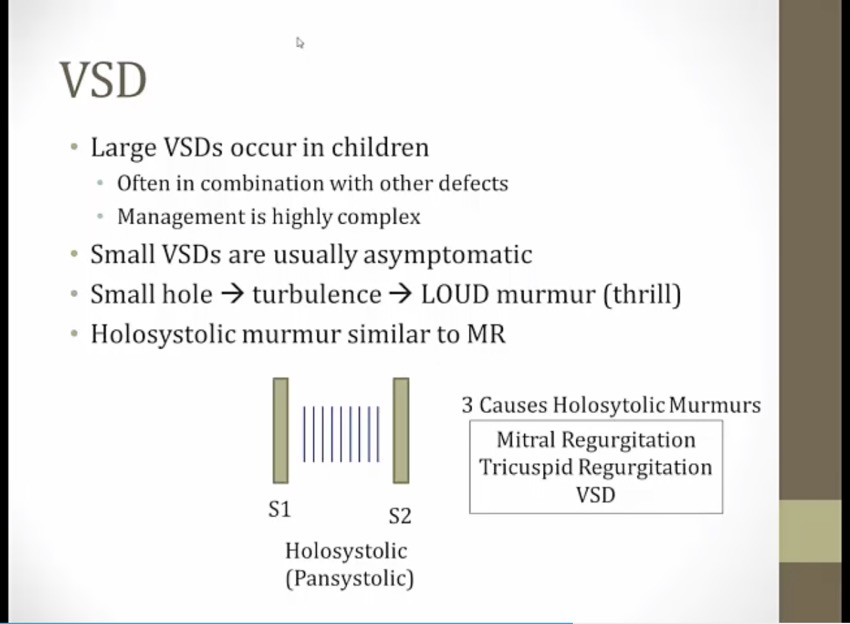 very loud murmur and asymptomatic: rare, VSD (mitral, tricuspid regurg very sick with loud murmurs)