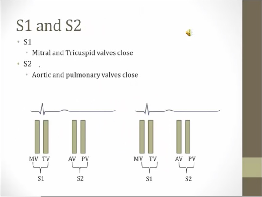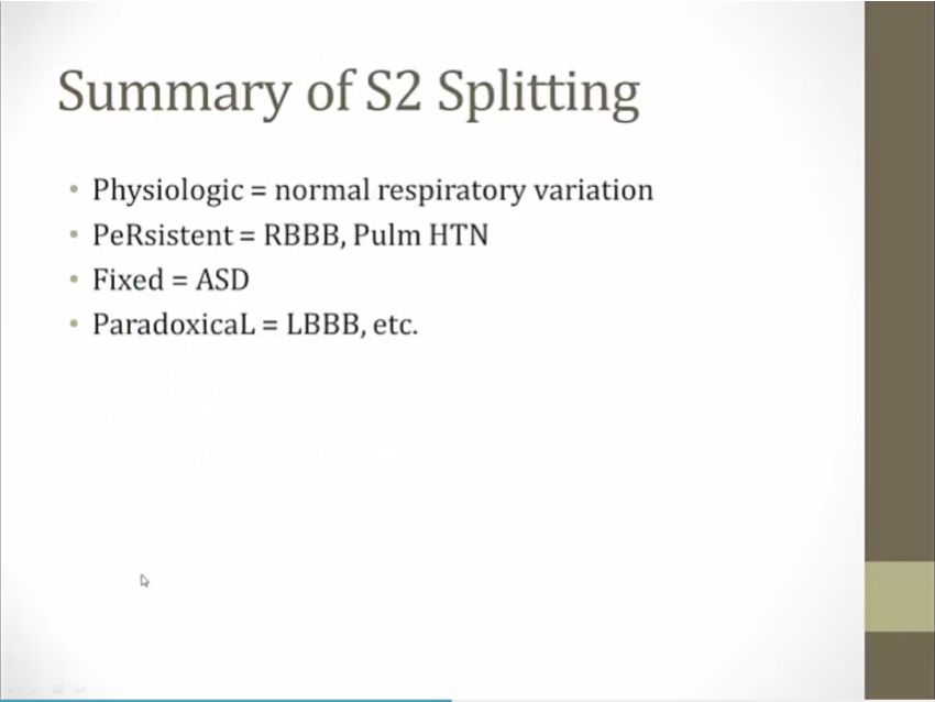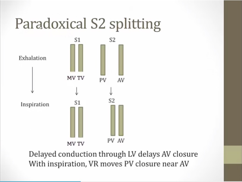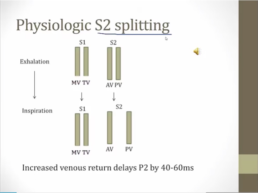 exhalation: some separation of aortic and pulmonic components of S2, increases with inspiration, doesn't go away in exhalation
