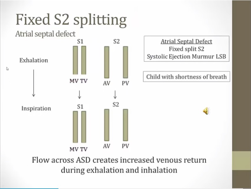 ASD: blood from left to right, always have increased venous return to right, even during exhalation