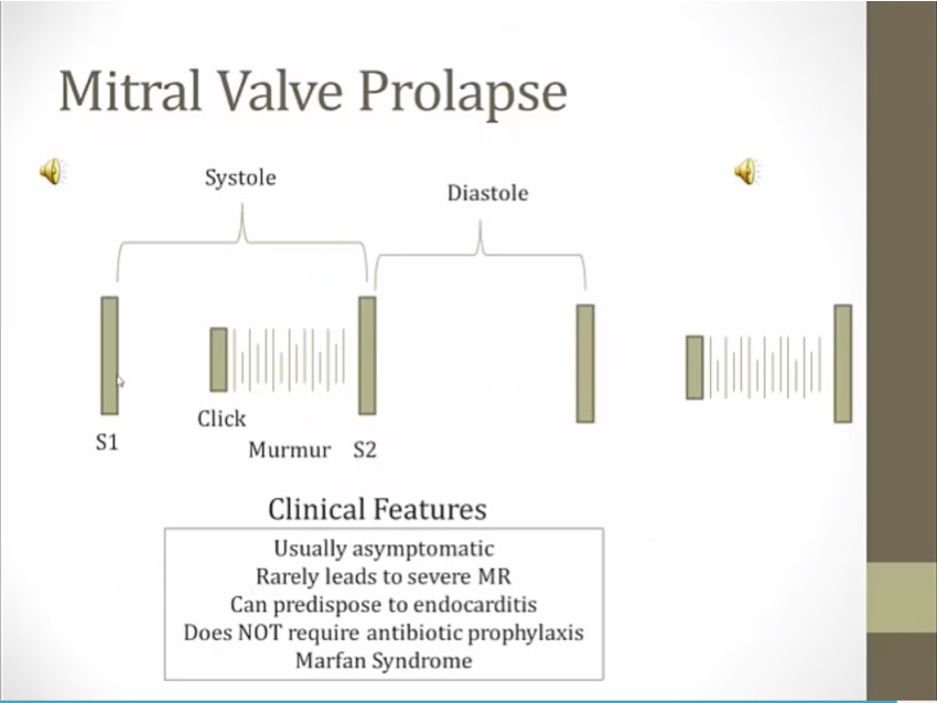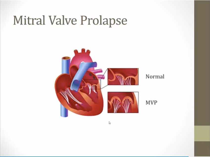 MVP: leaflets bellow up into LA, leaflets damaged and stretched, cause click when leaflets snap up into LA like a parachute, small amount of mitral regurge after click