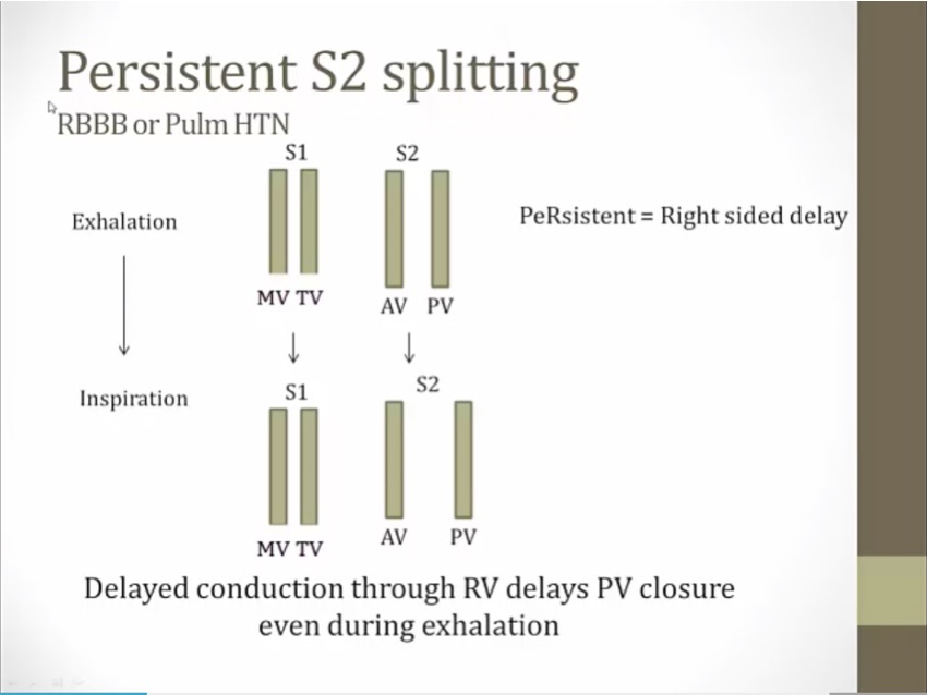 RBBB: delayed contraction of RV, even during exhalation, PV closure late