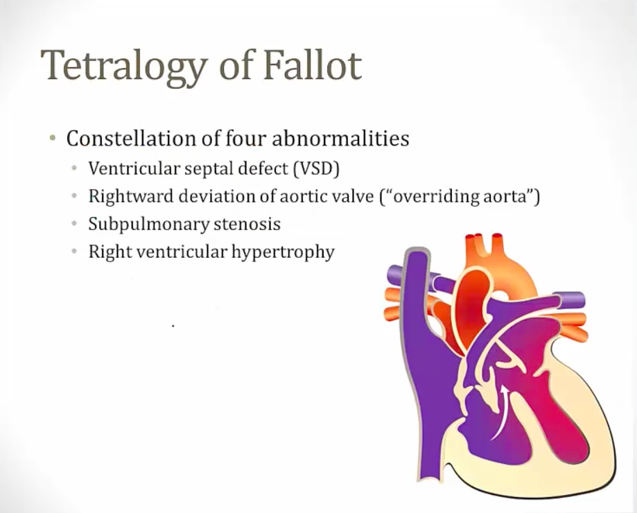 pic: aorta shifted to right, override ventricular septum with VSD, thick RV walls, stenotic PV