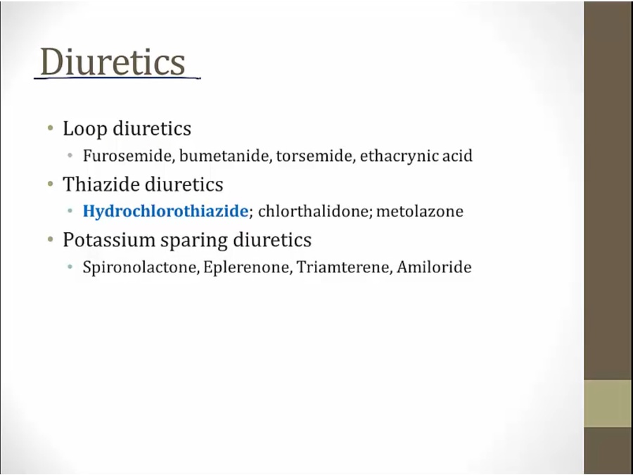 HCTZ: used often for antihypertensives by inhibit Na absorption