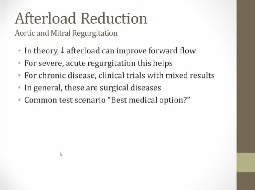 choose medication that lowers afterload, increase forward flow