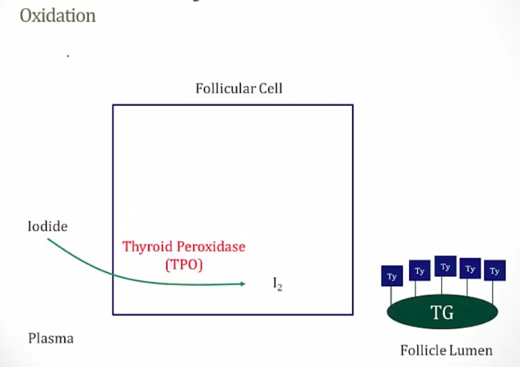 _Iodide (I-) is transported into the follicular cell via the Na-I cotransporter and then into the lumen of the follicle..