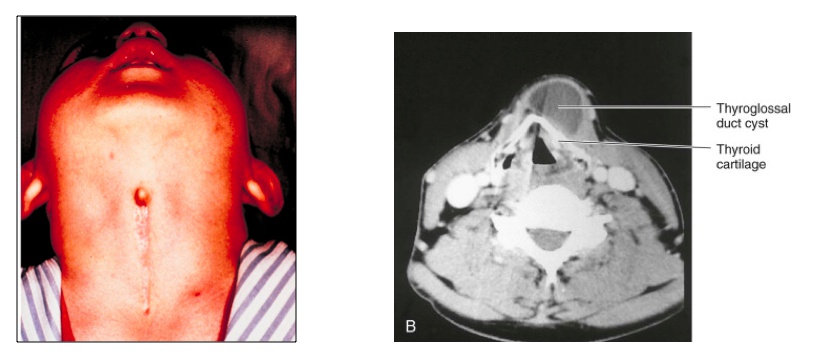 A thyroglossal duct cyst/sinus occurs when part of the thyroglossal duct fails to obliterate correctly, subsequently forming a cyst or sinus.
