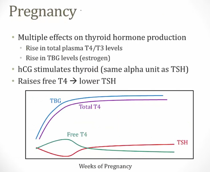 _Conditions where TBG is increased (e.g. pregnancy) or decreased (e.g. liver failure) can affect total T3 or T4 levels. Increased estrogen during pregnancy causes increased TBG, which results in increased total T3 and T4 levels. However, the free T3 and free T4 levels are actually normal (therefore, pregnancy is not a hyperthyroid state)..
