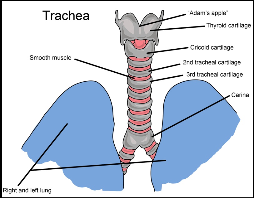 _The thyroid gland consists of 2 lobes located anterolaterally, which span the area between the oblique line of the thyroid cartilage and the 5th tracheal ring..