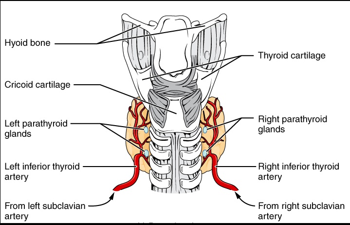 _These are 4 small circular glands found on the posterior surface of the thyroid gland. Clinical Correlate: Thyroid surgery is a common cause of removal or damage to the parathyroid glands..