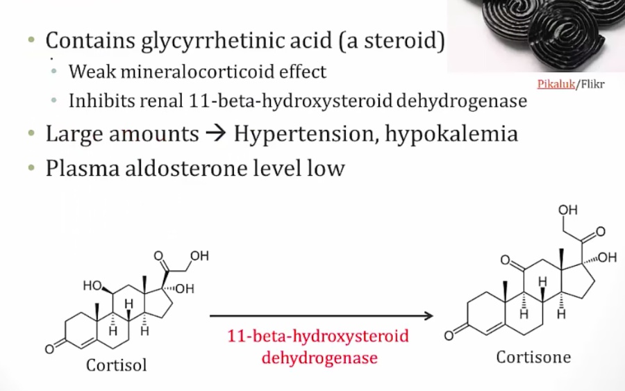 Licorice inhibits the breakdown = more cortisol = more aldosterone