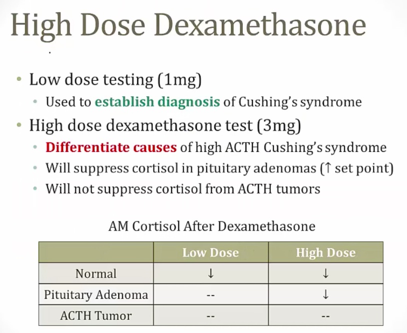 If high ACTH, use high dose dexamethasone to differentiate between pituitary or ACTH tumors