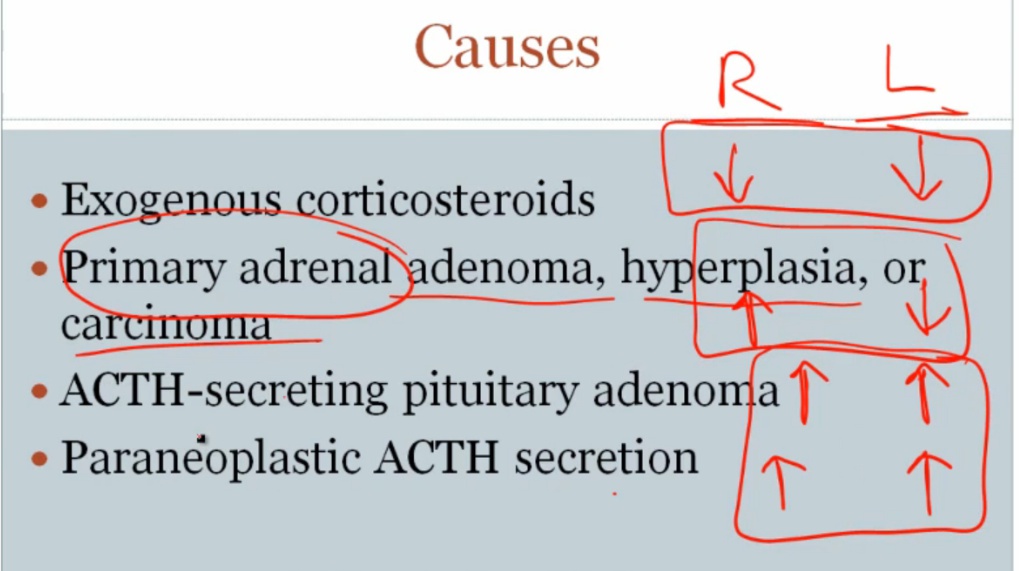 With exogenous, there's bilateral atrophy. In primary adenoma, there is 1 large and 1 small adrenal. Paraneoplastic and ACTH secreting must be distinguished because both have enlargement..