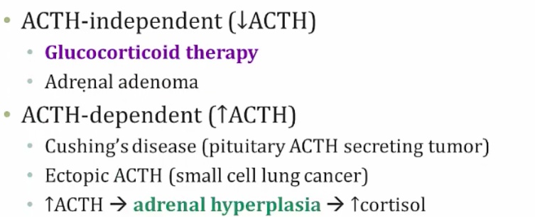 ACTH-independent: either exogenous cortisol (steroid) therapy or adrenal adnenoma producing cortisol. In this case, there would be a low ACTH from pituitary because of negative feedback