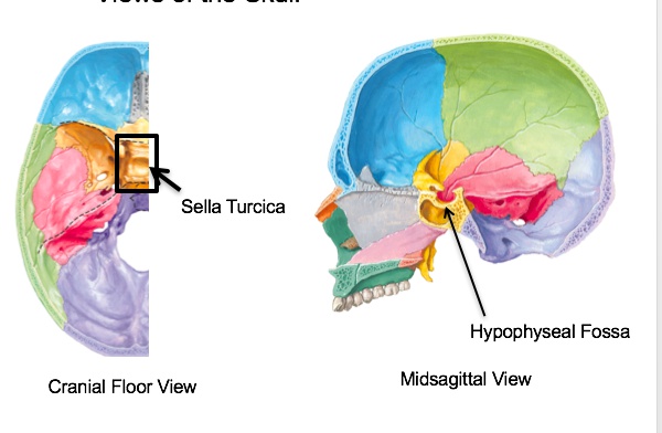 _Pituitary sits in the sella turcica (turkish saddle) of the sphenoid bone..