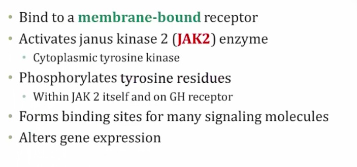 _Protein hormone and binds to surface receptors, uses JAK2-STAT pathway.,