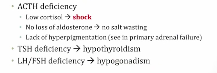 _The clinical manifestation of hypopituitarism depends on the specific hormone(s) that are lacking. For example, a deficiency of melanocyte stimulating hormone (MSH) may manifest as hypopigmentation, due to MSH's stimulatory effects on melanocytes.