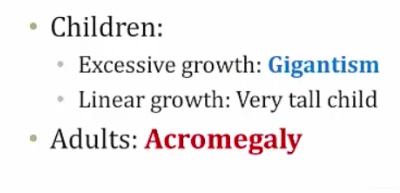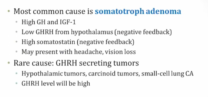 _Causes are usually due to tumor. Presentation can be different depending on where the tumor is. If the tumor secretes GHRH and is in the hypothalamus or the sytem, there would be a high GHRH level. If the tumor is in the anterior pituitary, there would be a low GHRH and high somatostatin level.