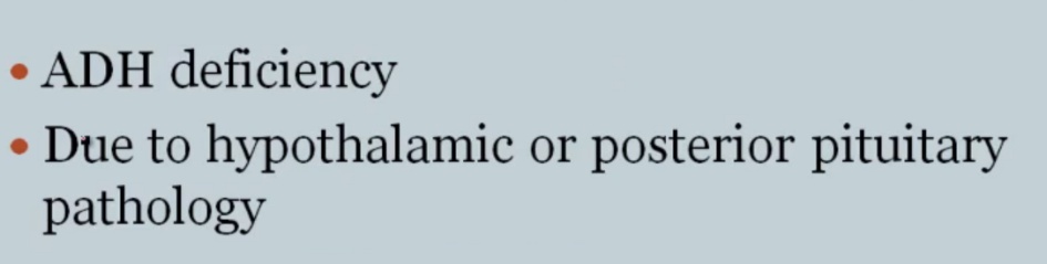 Central DI: a lack of antidiuretic hormone (ADH)