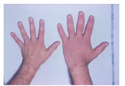 jaw, corse faces (enlarged nose, frontal bones)