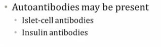 Islet cell antibodies are found in the vast majority of T1DM patients, as well as asymptomatic family members. Islet antigens that are the targets of autoimmune attack may include insulin and the β-cell enzyme glutamic acid decarboxylase (GAD).