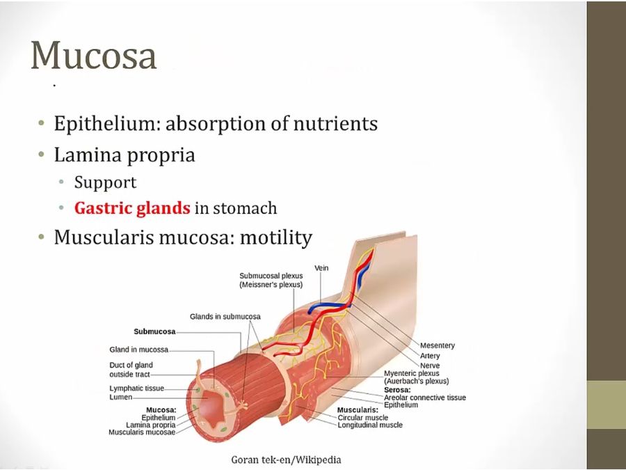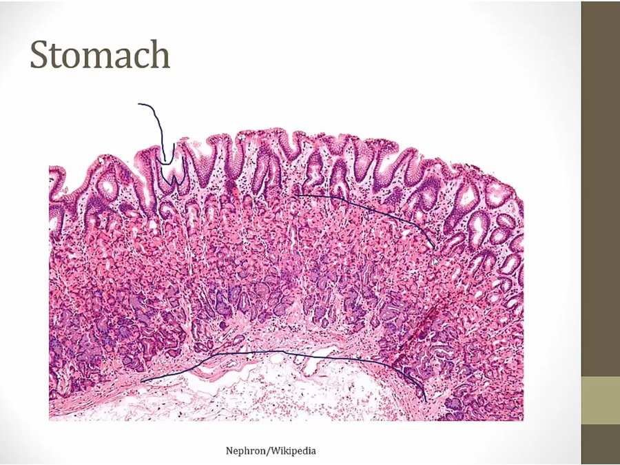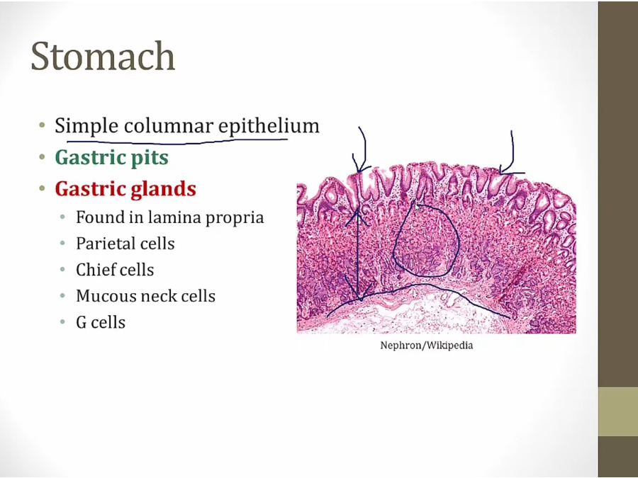 gastric glands: within lamina (circle)