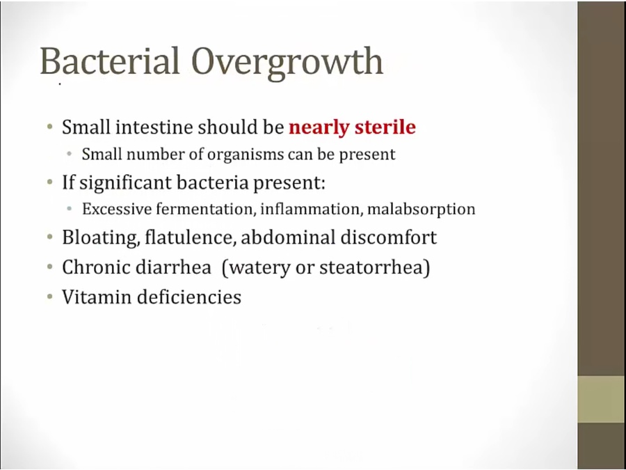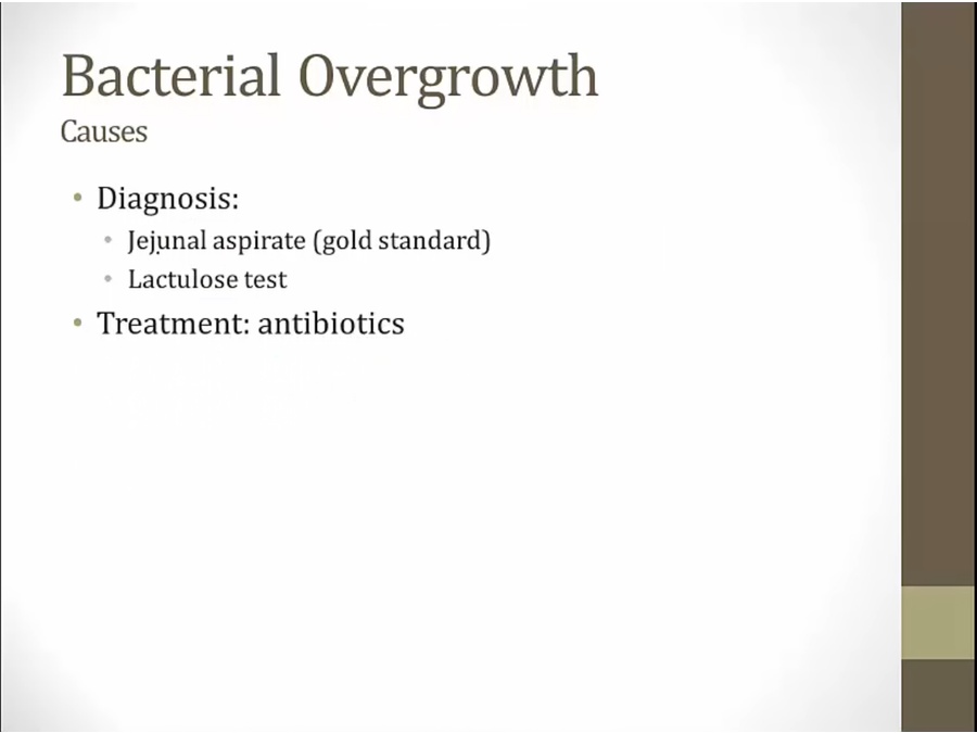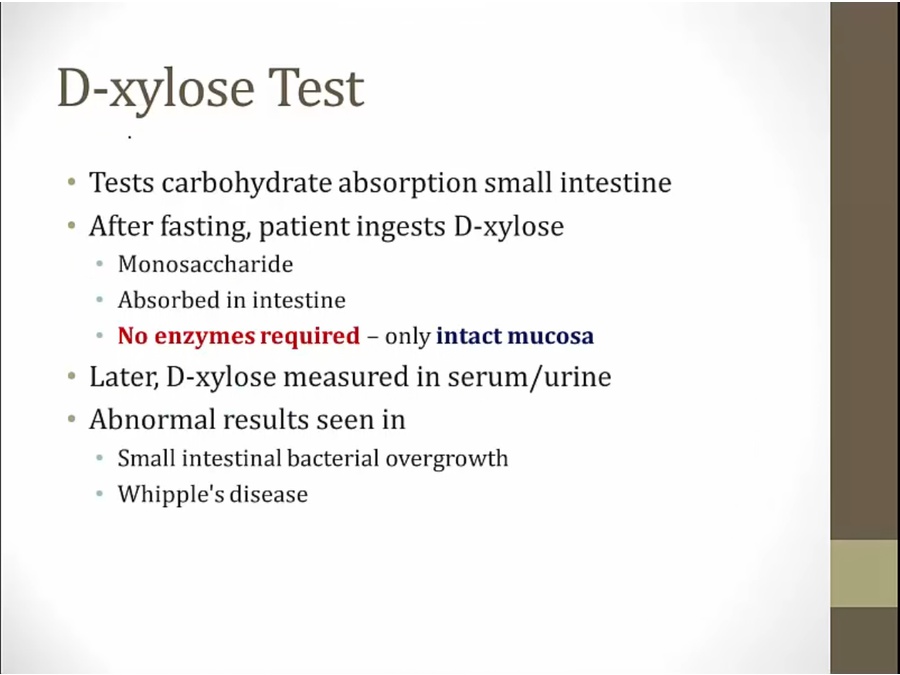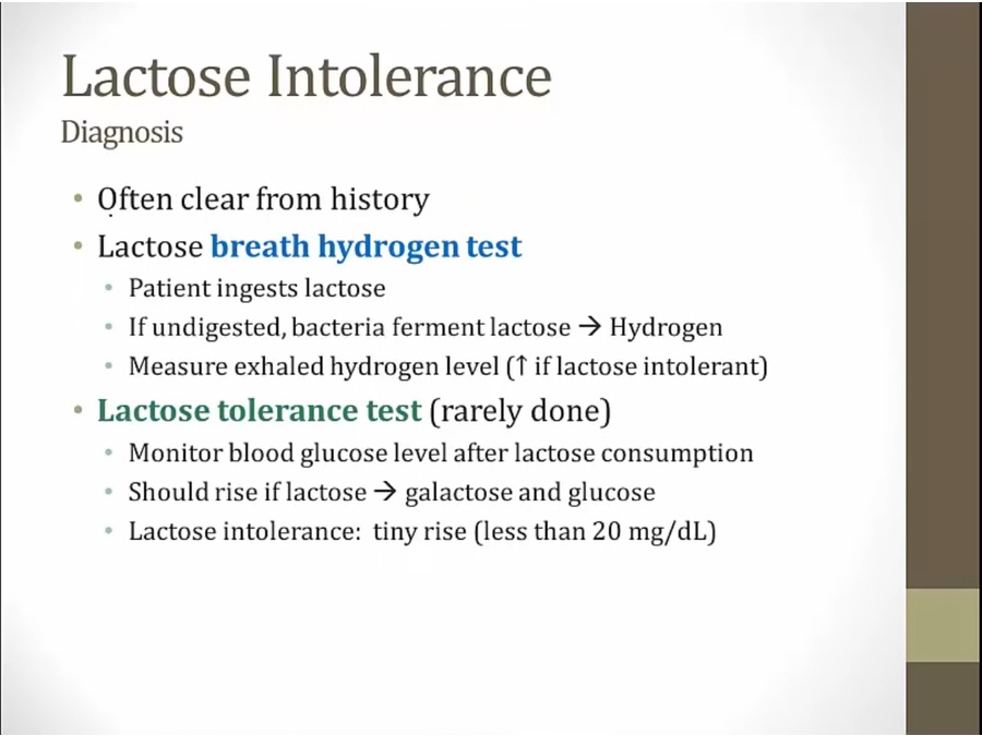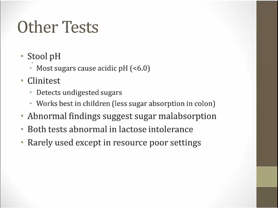 - lactulose: sugar molecule not absorbed, laxative, osmotic agent. Bacteria metabolized to hydrogen. Measure hydrogen