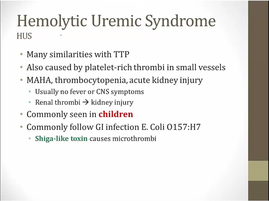 distinguish from TTP: no fever or CNS symptoms (TTP only with kidney)