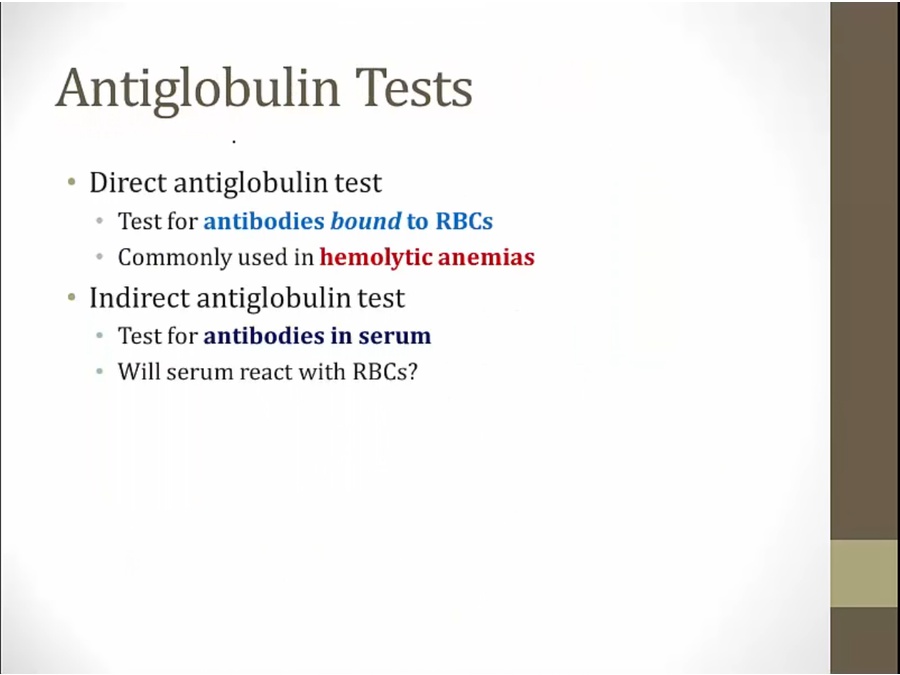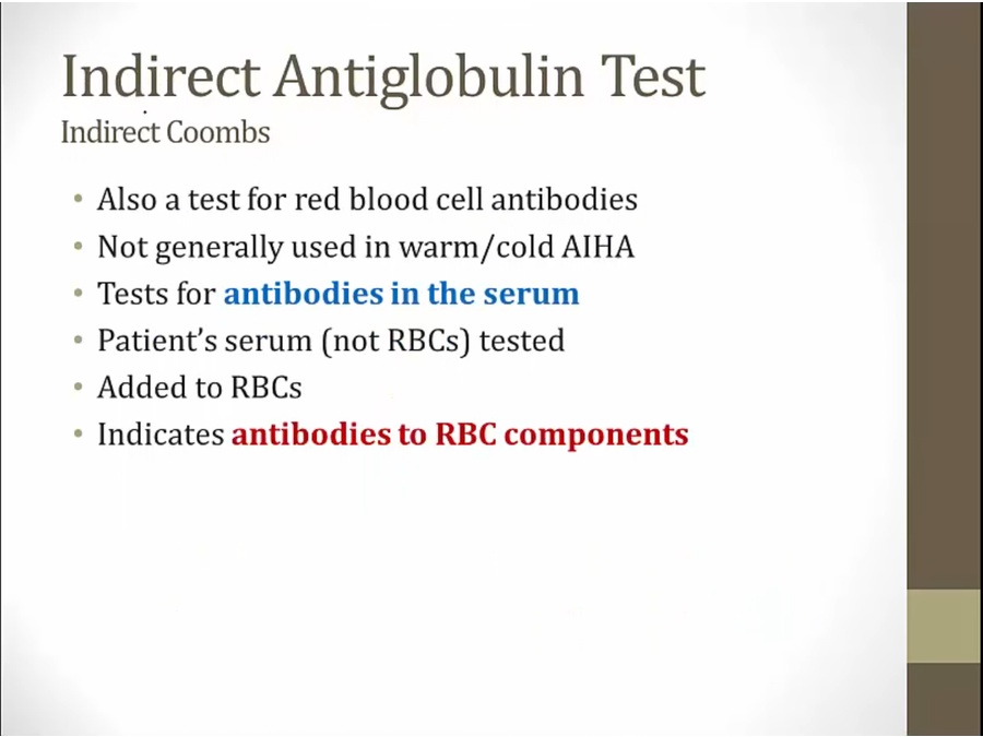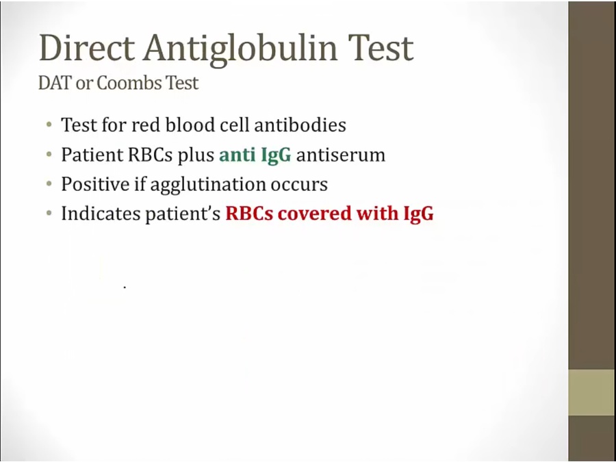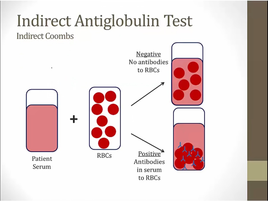take patient serum and add sample RBC. Positive if antibodies in patient serum to RBC