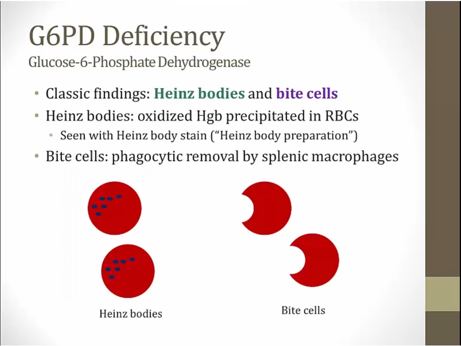 Bite and seeds: bite cells and Heinz bodies seen in RBCs