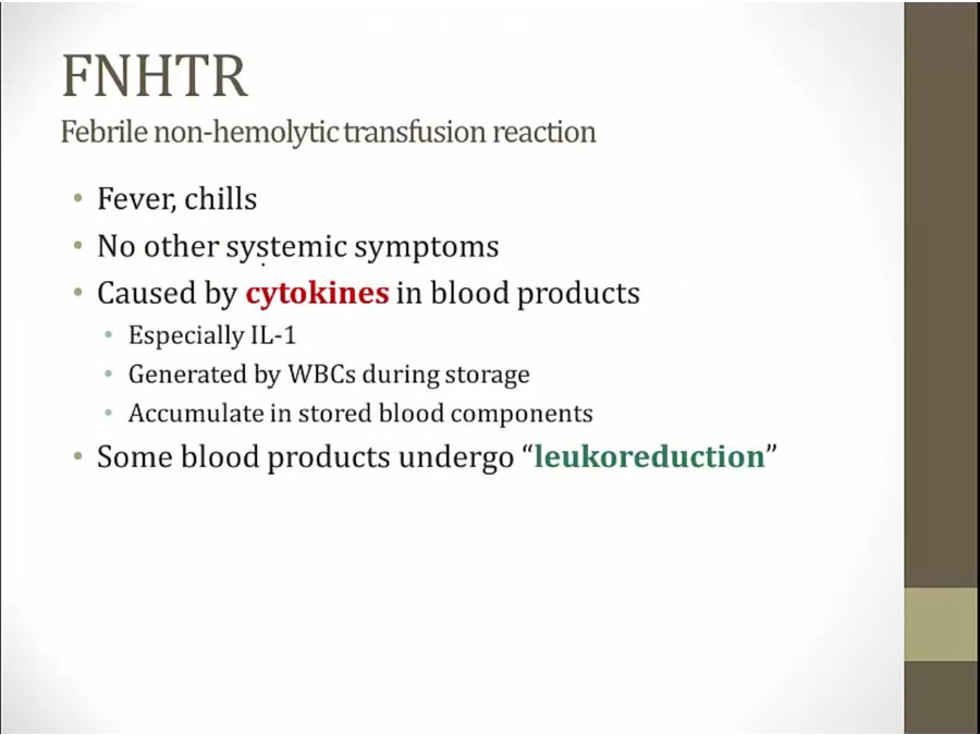 leukoreduction: eliminate WBC to reduce frequency of FNHTR